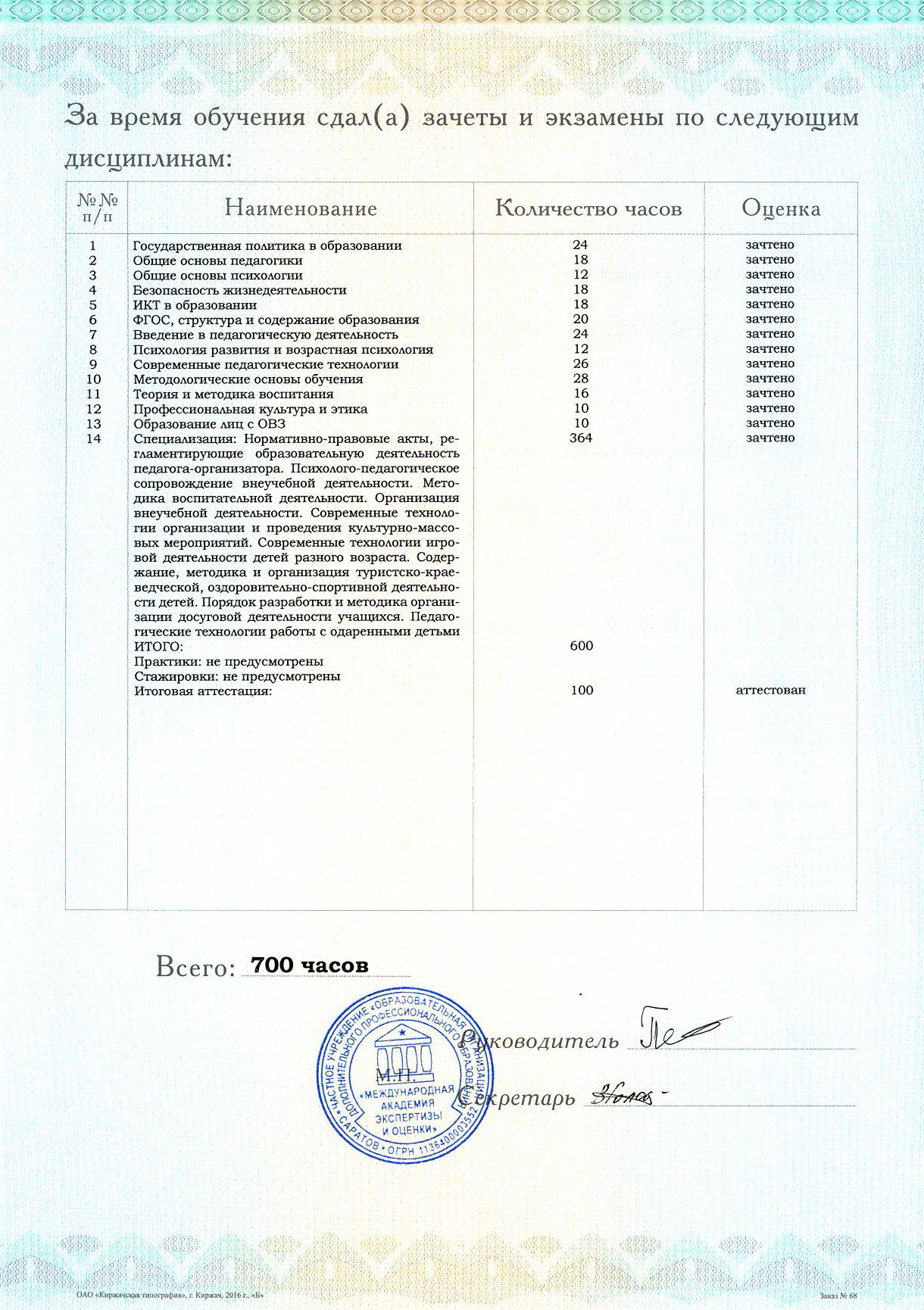 Объем программы: 700 часов.